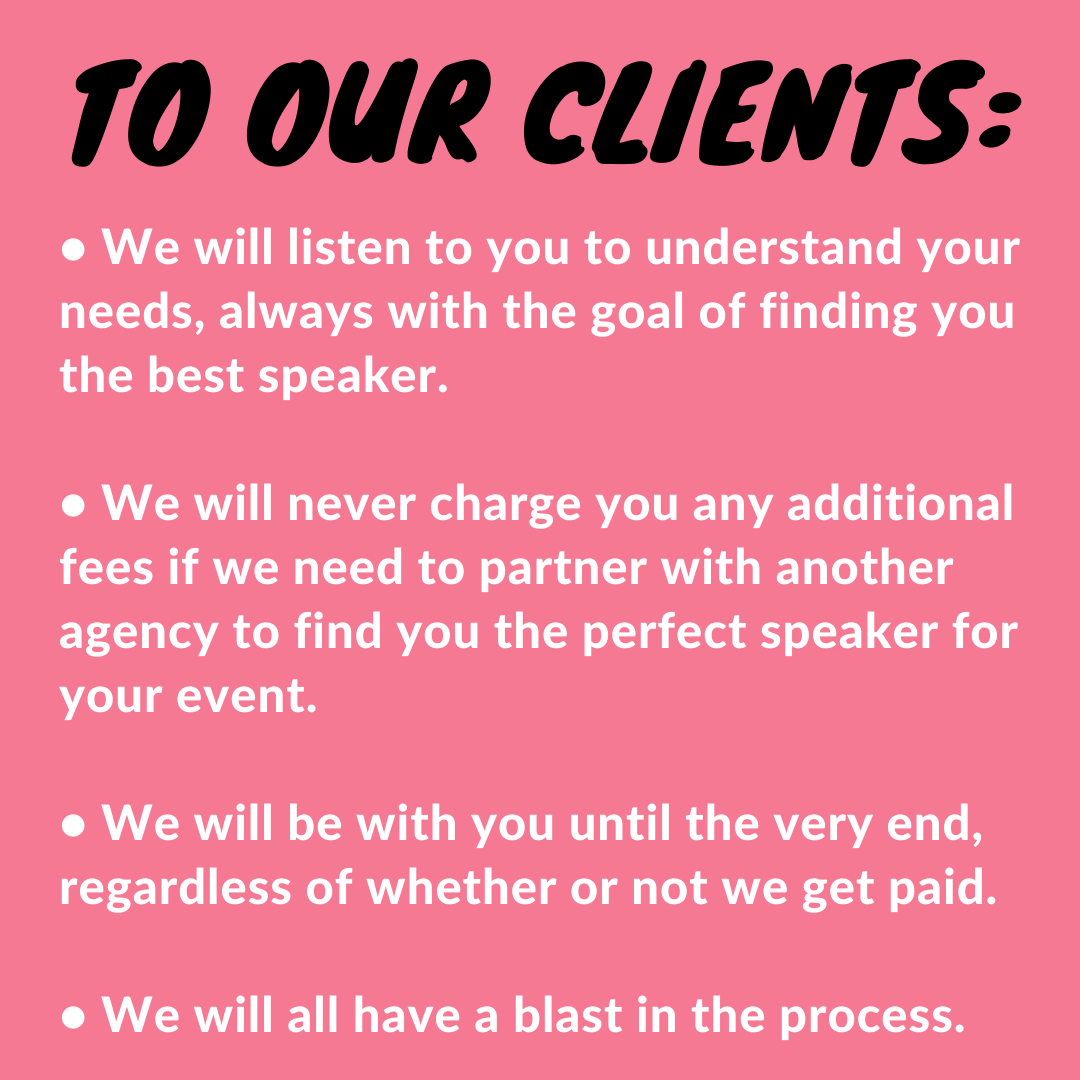Over the years working in the speaking industry at various agencies, we’ve learned that industry veterans have decided to unofficially regulate a lot of rules. They even have created an association with a paid membership to discuss and institute these rules and to create a space where agencies can share insights into what’s happening within their own organizations and with their clients. Although we are mostly rule-followers over here, and we agree with many of their “guidelines,” we knew we were just too outspoken about how we wanted to operate; we knew we didn’t need to pay some unofficial governing body to build an agency that operates honestly and in the best interest of our clients and our speakers.