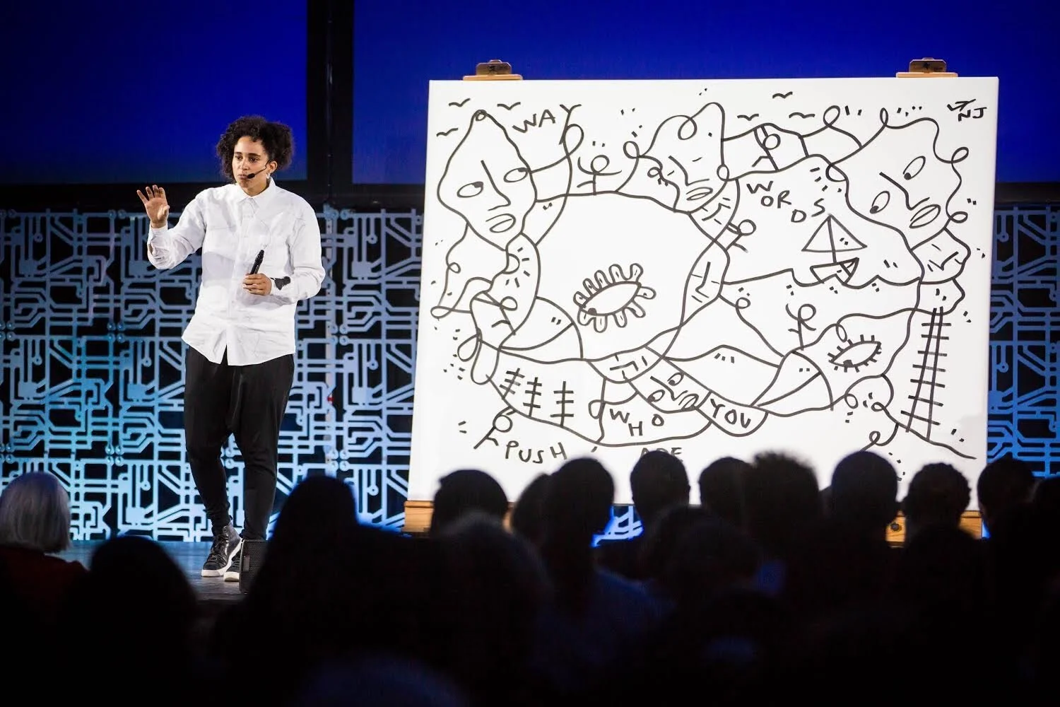 From immersive installations to interactive workshops, Shantell transforms spaces into vibrant hubs of creativity and connection. With her interactive presentations, each stroke and accompanying messaging unveils a narrative that resonates deeply with themes of self-discovery, community, identity and empowerment.